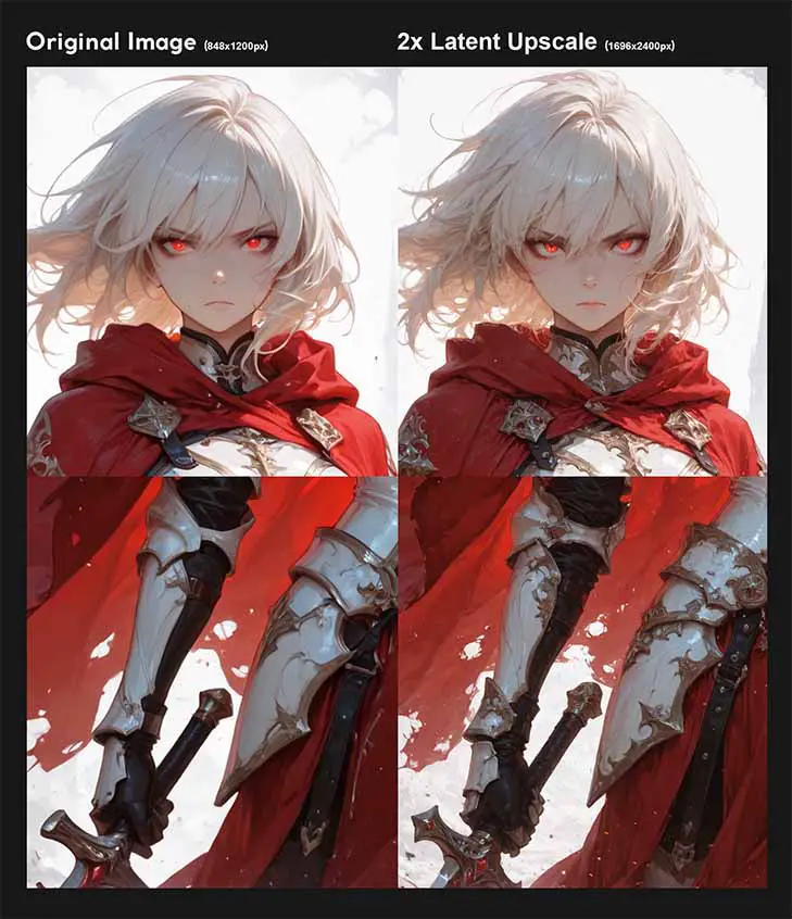 This means that your inference software doesn’t need to utilize the VAE to bring your image back to pixel space, upscale it, and then pack it back to latent space to run it through the img2img pipeline just to then use VAE to let you save it at the very end (this is exactly what happened with our image in the previous method).
