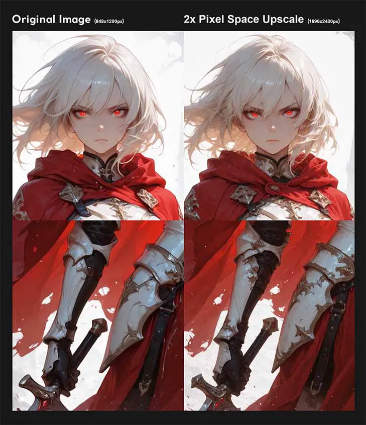 This is the most basic form of upscaling. It relies on using algorithms like Lanczos, Nearest Neighbor, or more advanced AI-based models like ESRGAN or 4x-UltraSharp to increase the pixel dimensions of your finished image.