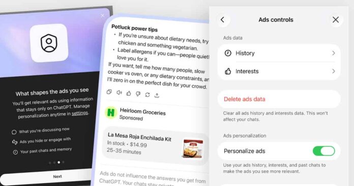 How ad selection works. The advertiser submissions are said to be matched to the conversation topic plus past chats and prior interactions with ads. The Help Center adds that basic context like general location or language can be used and that, if Personalized Ads is enabled, past chats and memory can be used starting in February 2026. This means that if you have the memory feature turned on and have not opted out of Personalized Ads, their content will automatically adjust to what ChatGPT has learned about you during all your remembered past conversations.
