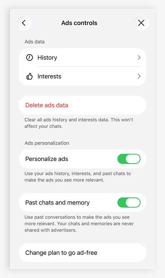 Controls and opt-outs. Users can hide/report ads as in almost any other digital ad system, open an “About this ad” context menu, delete their ad data, as well as toggle the aforementioned ad personalization (whether past chats/memory are taken into account when serving ads to your account). What’s quite interesting is that the free plan users can actually switch to an Ads‑Free mode at any time, although doing so they will be faced with lower chat message limits and reduced tool access.