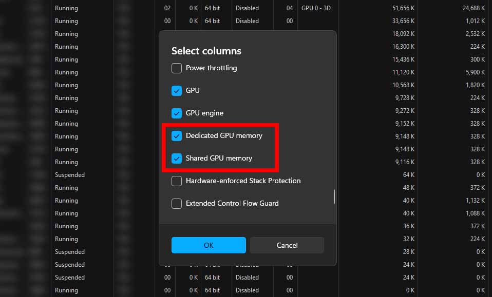 In the “Select Columns” menu, switch to the “Process GPU” tab. Here you can enable several GPU-related memory columns. Tick the GPU Dedicated Bytes (the actual VRAM currently used by the process), GPU System Bytes, and GPU Committed Bytes boxes, and exit the menu by pressing “OK”.