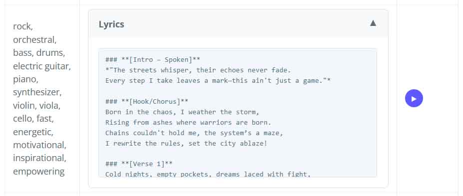 - In lyrics, you are expected to use blocks like [verse], [bridge], [chorus], [instrumental] etc., followed by the lyrics for the respective parts. This will ensure that the song will follow your desired structure.