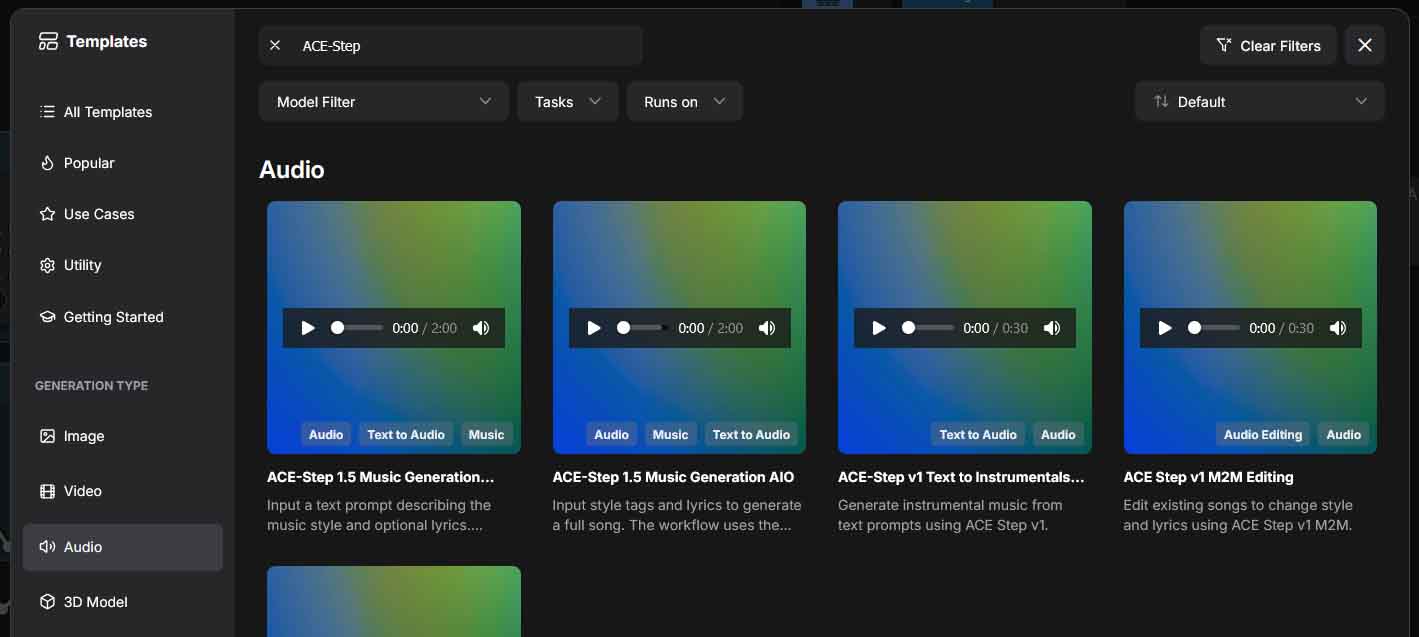 For the ACE-Step v1, ComfyUI includes both the text-to-audio, and the audio-to-audio workflows in the template browser. You can import and use them in the exact same way we did with the newer version 1.5.
