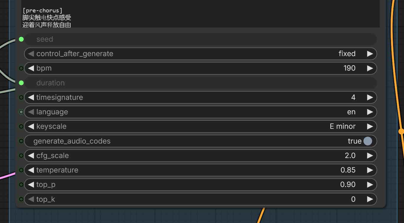 - Generate_audio_codes – toggles whether the node outputs the intermediate “audio codes” along with conditioning for more advanced workflows, for instance in Cover mode. This can be useful if you plan to pass these codes to a separate refiner or save them for later editing.